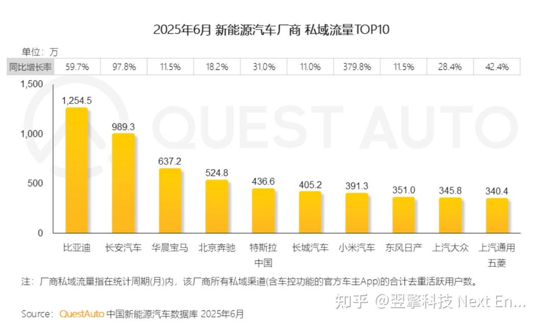 2025年汽车用户已经全面进入智能化,不仅追求智能驾驶,更期待智能生活。QuestAuto 数据显示,截止6月,新能源汽车厂商私域流量快速增长,反映出用户对智能化服务的需求增加以及品牌粘性的提升。